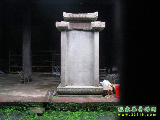 土司德政碑立于司城衙署遺址左側(cè),由青石雕鑿而成。碑高2.74米,寬1.2米,腹背刻字,上有石帽蓋頂,旁扶石柱。此碑是清康熙五十二年(公元1713年)2月永順土官為永順等處宣慰使彭泓海歌功頌德而建。碑頭篆書“甘棠遺愛”四字。正碑兩側(cè)有一對(duì)聯(lián):“一片石銘恩德厚,千秋歌頌山河新”。正中刻有“欽命世鎮(zhèn)湖廣永順等處軍民宣慰使司宣慰使都督府致仕恩爵主爺中涵德政碑”。碑文記述了所轄58旗、380洞軍民懷念彭泓海之德政以及“嘗聞恩可結(jié)民心,不能使民心之不忘記,功可顯當(dāng)時(shí),不能使后世之取法”的土司統(tǒng)治信條。