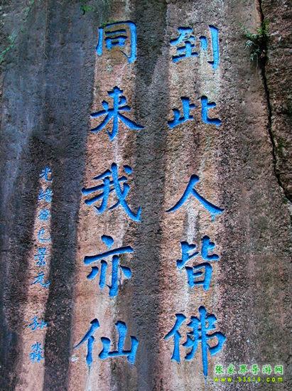 不二門內(nèi)由石灰?guī)r風(fēng)化形成的一尊巨大石佛,聳立于萬綠叢中,高六丈,青冠白面,頭頂白云,腳踏碧水,人們以其形神稱為“觀音巖”。《永順縣志》稱“觀音巖素有‘湘景名峰第一巖’之稱”。觀音巖下,聳立著一組瑰麗多姿、古色古香的殿閣建筑群,這就是“嵩山堂”,包括三觀殿、玉皇閣和禪房客舍,工藝精巧,玲瓏別致。特別是正殿后的地藏庵,與老司城明代建筑祖師殿結(jié)構(gòu)相似,背倚石壁,右通八陣圖,左達熱水坑,周圍怪石森列,古木參天。觀音巖北部山上是天造地設(shè)的“八陣圖”,有的如排戟,有的似春筍;有的像古佛,有的若走獸。八陣圖之奇,不僅在于它林立的怪石,最主要的是在于由龜裂紋石板鋪成的時上時下時隱時現(xiàn)的彎彎小徑——或穿過地下幽深的石洞,或延展于密林雜草叢中,或環(huán)繞于奇峰怪石之間,使八陣圖的東、南、西、北四門相通,復(fù)雜繁多的石徑互相連接形成網(wǎng)絡(luò),人們有時難以找到出路。也許,這就是八陣圖命名的緣由。不二門內(nèi)兩側(cè)石壁開闊如屏,歷代文人墨客或贊山水之幽絕,或抒心胸之豪情,雕鑿了種種摩崖石刻。據(jù)《永順縣志》記載,不二門石刻有神秀獨鐘、吾道南來、白云門開、砥柱中流、眼前南海、百寶勝光、別開生面、別有天地等100多處。歷經(jīng)風(fēng)雨滄桑之后,現(xiàn)僅存鬼斧神工、勝境無雙、滌盡塵氛、瞻奇仰異、海上飛來等數(shù)十處。清代名士白介庵所作《松徑留云》、《古洞仙蹤》、《層閣聳翠》、《玉嶂屏環(huán)》、《澄潭月影》等觀音巖八景詩尚凸現(xiàn)在石壁之上。其中《石門天鑿》一詩完整無缺:“法門高聳五云偎,鬼斧神工妙化裁。鞭石無痕還著相,振山有鐸不須錘。地沾花雨千歧坦,道接薪傳一線開。莫道終南稱捷徑,巨靈神辟小蓬萊。”清代庚辰年間的探花景元,曾在石壁上題刻“到此人皆佛,同來我亦仙”。他還以一筆揮成的“山青海岸”疊字如圖似的符合成一個“岸”字鑿刻在摩崖之上,堪稱罕世之作。石壁上近年來還鐫刻了偉人毛澤東的詩詞和儒將蕭克、畫家黃永玉等巨擘的題字,游人置身其間,飽享山水美景、名勝古跡與文化藝術(shù)的熏陶。