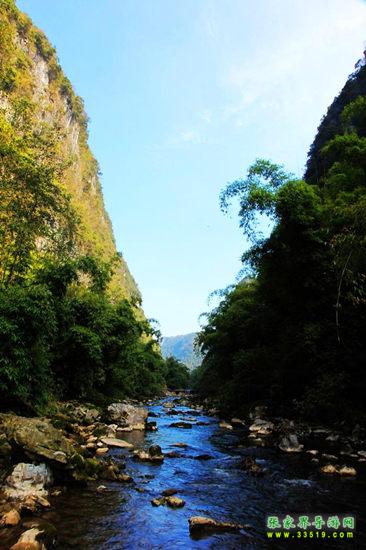 皮渡河沿岸修竹蒼翠,形成翠綠色的長廊,河水清澈透亮,象一條綠色鍛子串起無數(shù)明珠。峽谷中水與山親吻,形成靈動的水韻與雄渾的山巒,構(gòu)成一幅山水長卷