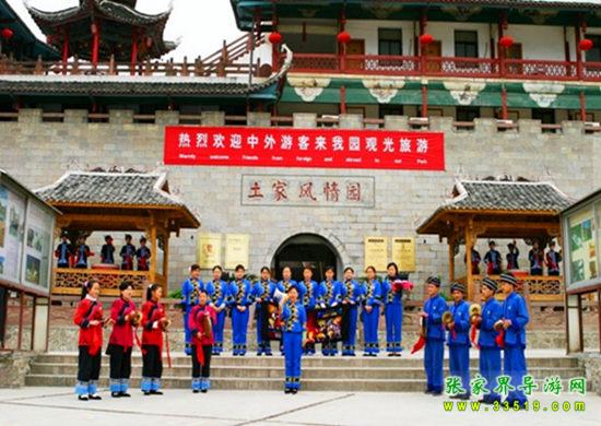土家風(fēng)情園座落在張家界市內(nèi),占地5公頃多,是一座人文景 觀與自然景觀相融合,集旅游觀光、文藝表演、奇珍展覽、住宿、娛樂(lè)、購(gòu)物等于一體的大型綜合性旅游服務(wù)企業(yè)。其主要由土家建筑群落、民風(fēng)民俗展示、文藝表演、客房、餐飲、大型狩獵場(chǎng)、珍稀植物園、根雕基地等功能區(qū)構(gòu)成。園內(nèi)建筑多為木石結(jié)構(gòu),雕梁畫棟,金碧徽煌、飛檐翹角 、玲瓏雅致。2001年4月,國(guó)務(wù)院總理朱镕基入園視察并給予很高的評(píng)價(jià)。2002年9月,由一千人參加表演的千人毛古斯舞蹈活動(dòng)在園內(nèi)舉辦并獲得圓滿成功,千人毛古斯和九重天吊腳樓同時(shí)被列入世界吉利斯記錄。2004年1月,土家風(fēng)情園被評(píng)為國(guó)家4A級(jí)旅游區(qū)(點(diǎn))。