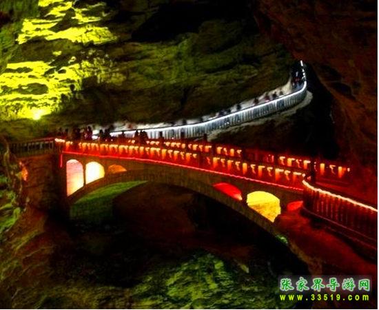 橋長22米,橋面寬3米,距水面17米,這是我國游覽洞穴中最大的石拱橋,是為迎接1995年國際溶洞會議在黃龍洞召開而修建的。橋的欄桿全部用當地的“土特產”木紋石建造。