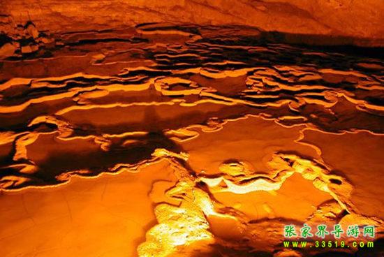 “黃‘龍’之水天上來”,這里洞頂與外界僅一層薄薄的巖石相隔,天上雨水匯集起來滲透巖層便形成黃龍洞內流量最大的一股泉水——天仙水,其落差達27.3米。“飛流直下三千尺,疑是銀河落九天”,誰能想象洞中竟有這樣雄偉壯觀的瀑布?天仙水下面是層層疊疊的石梯田,連綿起伏,有人說這是龍王爺的萬頃良田。
