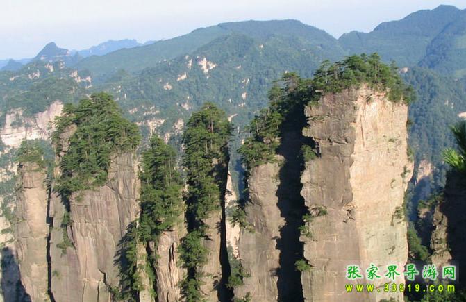 黃石寨西北崖沿下,6座高達200多米的橢圓形石柱,呈南北向一字排開在黃石寨與袁家界之間約2000米長的溝谷中。石柱大小和間距相當(dāng),柱頂皆為平臺,似一派待建橋面的橋墩。中間兩墩稍高,兩邊漸次降低。各柱頂可連成一條弧線,氣勢恢宏。橋墩下河床干涸,怪石嶙峋,樹木依稀,顯得古野、蒼涼。雨天,云霧滿壑,似一江怒濤,橋墩時隱時現(xiàn)。若逢東邊日出西邊雨時,便有絢麗壯闊的彩虹南北飛架,與橋墩形成雙美合壁的奇觀。