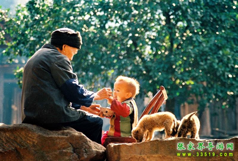 孩子們自從娘胎里出來,父母們就給備好了一首首童謠。在襁褓中時,有簡短的搖籃曲。“我的小寶貝,睡吧快快睡,你莫哭,快長大,我的小寶貝”,伴以“喲嗯”之類的喉音和鼻音。哭鬧的孩子在這低低的吟哦中,在這輕柔的春風(fēng)中,會緩緩的走入夢鄉(xiāng)。到孩子牙牙學(xué)語時,就會換上新的內(nèi)容。為讓孩子從小懂得廉恥,大人會教孩子《蟲蟲兒飛》:“打板板,逗蟲蟲兒,蟲蟲兒飛,飛到嘎兒(外公)去。嘎兒不趕狗,咬到蟲蟲兒的手;嘎兒不殺雞,蟲蟲兒不回去;嘎兒不打蛋,蟲蟲兒不吃飯;嘎兒不殺鵝,蟲蟲兒不過河。”(土家把孩子名字叫得賤,喊成“蟲蟲兒”)。在唱的同時手把手地教孩子做蟲蟲飛的動作。唱完后,又會用手指點點孩子的左右臉,刮一下孩子的鼻子,“這兒也丑,那兒也丑,鼻子刮豬油。”意思是好吃是丟臉的,蟲蟲兒可不能這樣。勤勞是做人的根本,也是土家人的傳統(tǒng)美德,“三歲看大,八歲看老”,大人會教些勤勞的童謠?!顿u豆腐》道:“一顆豆子圓又圓,推成豆腐賣成錢,別人講我生意小,小小生意賺大錢。”為讓孩子自小懂得親疏,教孩子《推磨》:“推磨拐磨,推的粑粑白不過。推粑粑,接嘎嘎,嘎嘎不吃娃娃的酸粑粑;推豆腐,接舅舅,舅舅不吃娃娃的酸豆腐;推合渣,接姨媽,姨媽不吃娃娃的酸合渣……”夏日的夜晚,一家人出來在月亮地里歇涼,有夜火蟲(螢火蟲)舉著火把飛來,母親會以夜火蟲打頭,以“一問一答”的聯(lián)句方式,考考孩子的記憶力:“夜火蟲,夜夜來,嘎婆接你吃茶來。什么茶?豆茶。什么豆?黃豆。什么黃?朱砂黃……”