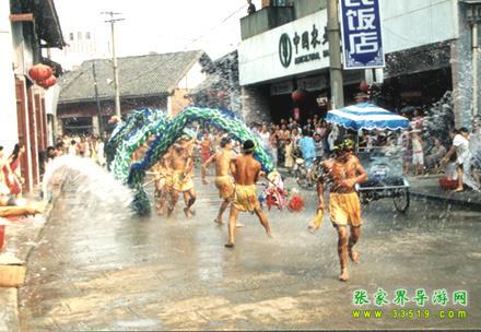 張家界潑水龍又叫“澆水龍”,于唐朝時期由移居本地的白族興起演變而成,在永定區(qū)的尹家溪鎮(zhèn)西尹村、莫家崗村十分盛行,是當?shù)?a class="insidelink" href="http://www.shengyuwood.com/fengqing/" title="土家族">土家族,白族、苗族在天熱干旱時節(jié)求雨祈福的一種形式。一旦出現(xiàn)旱災,當?shù)仡^面人物就會出來組織潑水龍,演出極其隆重。