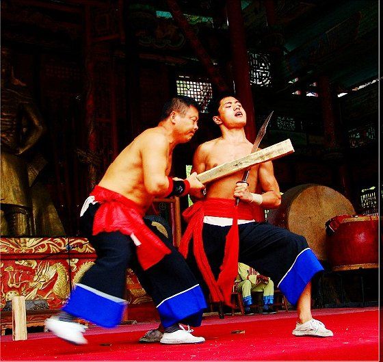 大庸氣,堪稱武林奇葩,曾為祖國(guó)贏得聲譽(yù),海內(nèi)外享有極主名望。 大庸氣功是大庸各民族特別是土家族傳統(tǒng)體育項(xiàng) 目之了,分健體氣派、武術(shù)氣功兩類。前者有“返還 功”、“馬王推氣功”、“少林達(dá)摩醫(yī)療保健氣功” 等;后者有靜坐、壁虎、靈子、二指彈、碎石、松靜 、硬氣、五禽、五陽功等,尤以硬氣功著稱。大庸硬 氣功,歷史悠久,漢代相單程,明代覃后,清代劉明 燈,當(dāng)代湯子模、周鐵鞭、杜心武、趙繼書等都具有 超人硬氣武功。大庸土著民族在漫長(zhǎng)的反征服、反壓 迫斗爭(zhēng),博采武當(dāng)、少林南北派、昆侖派眾家武林精 華,創(chuàng)造出獨(dú)此一家的大庸硬氣功。 據(jù)傳,大庸硬氣功鼻祖是楚國(guó)鬼谷子。《永定縣 志》有關(guān)鬼谷子隱居天門山鬼谷洞潛心學(xué)《易》、傳 授方術(shù)的記載。到清代有武林高手朱茂嶺,隱居三岔 村北芭蕉灣洞,研究鬼谷氣功之術(shù),后收西溪坪胡口 子、余世萬(即“余通人”)為徙,傳其衣缽。余通 人將武術(shù)氣功系統(tǒng)整理,發(fā)揚(yáng)光大,播名于世。 新中國(guó)成立后,黨和政府十分重視民間氣功發(fā)掘 整理,并正式列為體育項(xiàng)目加以普及發(fā)展,今日大庸 市習(xí)練硬氣功達(dá)數(shù)萬人眾。永定區(qū)官黎坪村世有“硬 氣功之鄉(xiāng)”盛譽(yù),該村男女老幼,練功已蔚成風(fēng)氣, 其武師趙繼書,1979年先后參加全省和全國(guó)武術(shù)大賽 ,均獲一等獎(jiǎng),受到國(guó)家體委重視,同年7 月趙繼書 專程到北京給中央領(lǐng)導(dǎo)同志匯報(bào)表演。嗣后,隨同中 國(guó)武術(shù)代表團(tuán)和國(guó)家領(lǐng)導(dǎo)人先后兩次出國(guó),到盧森堡 、意大利、比利時(shí)、羅馬尼亞、馬其他和東南亞等國(guó) 家訪問。他表演的臥刀碎石、頭頂開石、雙鳳灌耳、 頭碰石柱、叉尖推磨等精彩節(jié)目,博得外國(guó)友人好評(píng) 。盧森堡一位榮獲國(guó)家獎(jiǎng)牌的武士,看了表演后連夜 來到中國(guó)大使館,將自己珍藏多年的獎(jiǎng)牌贈(zèng)送給他; 盧森堡國(guó)王主動(dòng)熱情走上臺(tái)與趙繼書熱情擁抱,連連 稱贊:“了不起!了不起!國(guó)際氣功大師!”并把珍 藏紀(jì)念章一枚贈(zèng)送給趙繼書。一位法國(guó)朋友十分贊賞 說:“中國(guó)的氣功,稱為全人類的寶貴財(cái)富,是有科 學(xué)道理的。”自此,大庸硬氣功譽(yù)滿全球。湖南瀟湘 電影制片廠專門拍攝了彩色紀(jì)錄片《大庸氣功》。 大庸硬氣功共有二十多個(gè)項(xiàng)目,最有影響的是: 腹臥鋼叉 由二人在地面扶住一根叉尖朝上的三 股鋼叉,叉尖猁鋒利,然后一個(gè)俯身叉尖,尖抵腹部 ,待其四肢平展懸空,扶叉二人轉(zhuǎn)動(dòng)鋼叉,謂之推磨 。表演時(shí),要求臥叉者運(yùn)氣于腹,氣意集中,稍有大 意,叉即穿腹而過。 臥刀破石 先固定兩把大刀,刀口朝上,臥刀者 運(yùn)氣后,由其他人抬臥于刀口上(有仰臥、俯臥兩種) ,然后在臥刀者腹部或背部置一碩大石條(約數(shù)百斤) ,一人或兩人輪大鐵錘狠擊石條直至斷裂破碎為止。 釘?shù)洞财剖?地上倒一層碎玻璃片,一人仰臥其 上;然后腹上置釘床,又一人仰臥釘床上,再于第二 人腹上置釘床,第三人仰臥刀床上,腹部上壓一塊數(shù) 百斤大條石,由人掄錘狠砸,至石破為止。 銀槍刺喉 用一根兩頭安有鋒利槍頭的鋼槍,抵 置兩位表演者喉部,然后相對(duì)發(fā)力,至槍桿抵成彎弓 形而喉部安然無恙。 徙手?jǐn)嗍?表演者將堅(jiān)滑如鐵一塊卵石置于石凳 (地)上,然后運(yùn)氣于掌或指擊斷(碎)卵石。 踢腿斬石 表演者運(yùn)氣于腿,以腿踢斷石條。一 般可踢斷15公分以上厚度的麻石條或青石條。 胸部打刀 將鋒利大刀刃口置于胸部肌肉上,用 一根拳頭粗木棒猛擊刀背,至棒斷而胸部無傷。 新中國(guó)成立以來,大庸民間武術(shù)與民族體育逐漸 融為一體,發(fā)揮著提高人民身體素質(zhì)、弘揚(yáng)中華武術(shù) 傳統(tǒng)和增進(jìn)國(guó)際友誼重大作用。除硬氣功外,還有數(shù) 十種武術(shù)形式散見于民間武術(shù)體育活動(dòng)之中。如打飛 棒、扭扁擔(dān)、抵搭斗杠、擠油渣、甩抱腰、舉石鎖、 板牛角(一種斗牛形式)等等。其特點(diǎn)是因地制宜, 不分場(chǎng)地,凡田園地角院壩集鎮(zhèn),都是習(xí)武練功、開 展活動(dòng)的處所,頗具泥土氣息。擬或以生活中某些動(dòng) 作和動(dòng)物的某種形態(tài),稍加模仿演繹,便成某一獨(dú)特 武術(shù)形式。如天門武術(shù)功夫大師余道人所創(chuàng)造的“宮 天梳”、“巖燕樸天門”等;也有就地理特點(diǎn)創(chuàng)造某 種武功形式的,如“蕩藤”等。