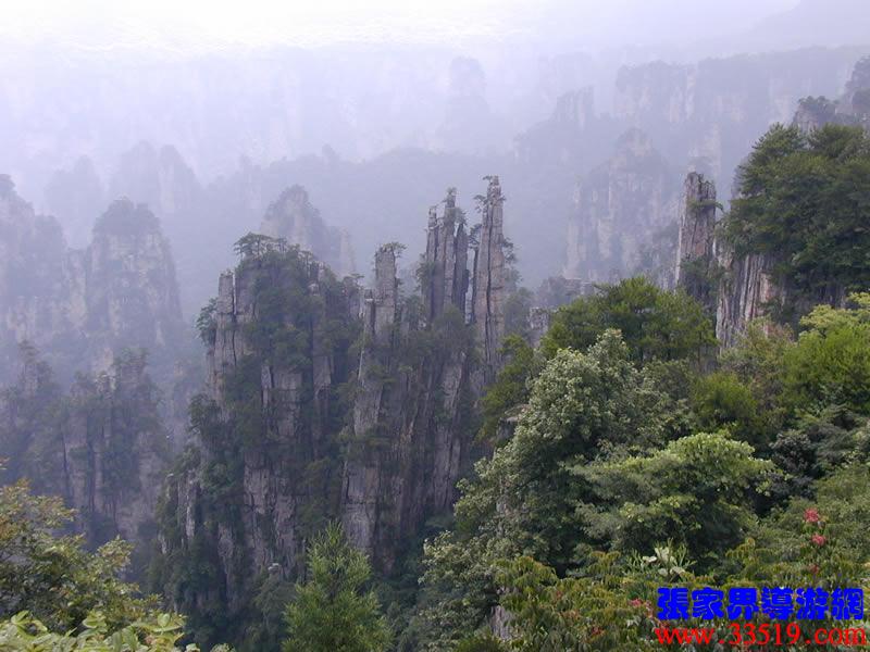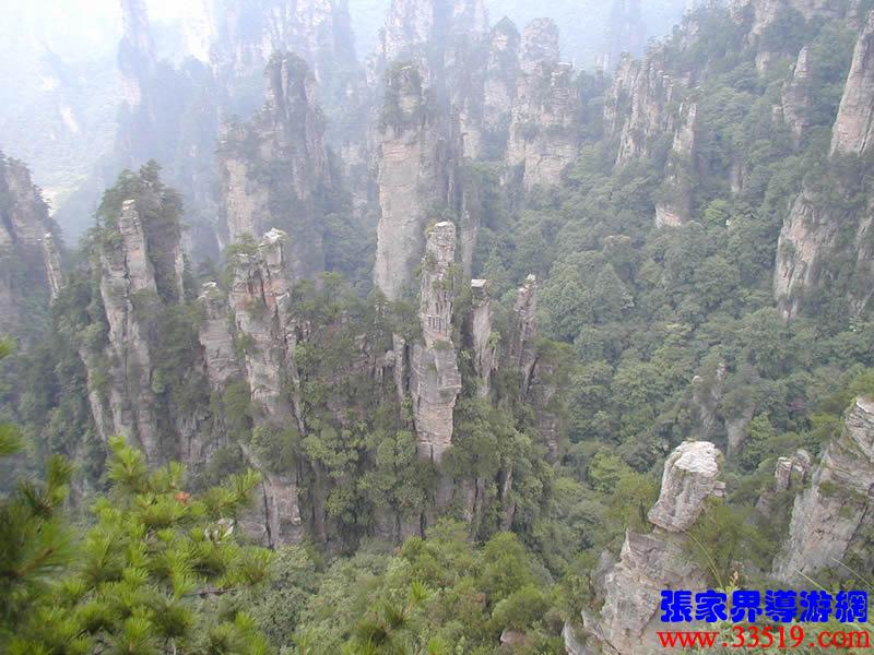 (大觀臺(tái))這就是大觀臺(tái)。極目遠(yuǎn)眺,千百座奇峰盡收眼底。一位詩人說,武陵源的砂巖峰林是一步一觀景,千步千造型,一山有四季,十步不同天。專家測(cè)算出武陵源石峰有3103座。一如一位高超的雕塑大師,模擬宇宙萬物,無不形狀逼真,維妙維肖,栩栩如生,呼之欲動(dòng)。有的如海螺出水,有的如金龜銜日,有的如蓮花盛開,有的如天橋橫空,有的如長槍刺天,有的如寶塔聳立,有的如老人采藥,有的如玉女梳妝,有的如將軍出征,有的如戰(zhàn)馬長嘯,有的如情人幽會(huì),有的如夫妻相擁,有的如仙女散花,有的如村姑守望有的孤峰獨(dú)秀,有的直插云霄,有的婷婷玉立,有的威武勇猛,有的小巧玲瓏,有的大氣磅礴。進(jìn)入武陵源,但見一片峰的森林,峰的世界,峰的海洋。挺拔、奇秀、集中、原始、粗獷、古野。這就是武陵源。一位藝術(shù)大師說:武陵源的山峰,改寫了山的概念。大攝影家陳勃說:“三山五岳堪比美,華夏風(fēng)光每一流。”王繼杰先生說:“武陵源上三日游,勝讀千篇李杜詩。”許世杰先生說:“秀幽險(xiǎn)峻稱奇絕,五岳黃山拜下風(fēng)。”李成瑞先生為此大抱不平:“神州勝景誰為最?須請(qǐng)霞公重評(píng)勘。”可惜徐霞客無緣到大觀臺(tái)來,也不可能為武陵源作甚評(píng)價(jià)了。