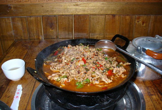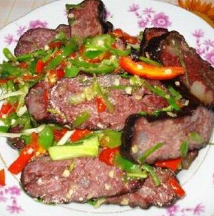 介紹: 血豆腐,就是將豆腐和豬血、豬肉及花椒、辣椒等佐料拌成泥狀,捋成卵形,以竹篩置火炕上,煙熏烤成臘黃,吃起來耐嚼味香,是土家特色菜,當(dāng)?shù)厝顺R云湎戮啤?在張家界的飯館里很難吃到正宗的土家特色菜,可以去做土味的特色餐館去解解饞。但是最正宗還是鄉(xiāng)下人家家里自己熏的,那才叫一個好吃?。。?/p>