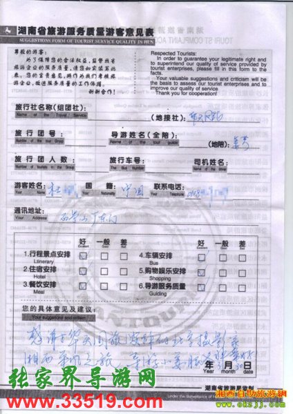 2010年3月30日北京杜先生一行11人張家界旅游質(zhì)量反饋