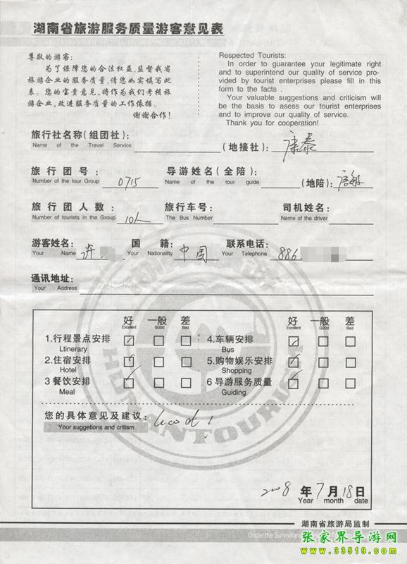 2009年7月15日許先生一行10人質(zhì)量接待反饋單: