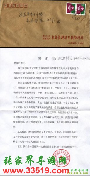 浙江省省級(jí)機(jī)關(guān)事務(wù)管理局車輛管理處致張家界康泰國(guó)旅導(dǎo)游黃濤感謝信
