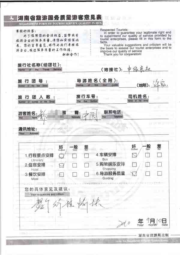 2010年9月10號(hào)婁底彭小姐一行4位旅游質(zhì)量反饋:整個(gè)行程愉快