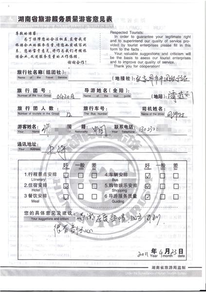 2011年4月23日張先生旅游質(zhì)量反饋:導(dǎo)游態(tài)度熱情,服務(wù)周到,很有責(zé)任心