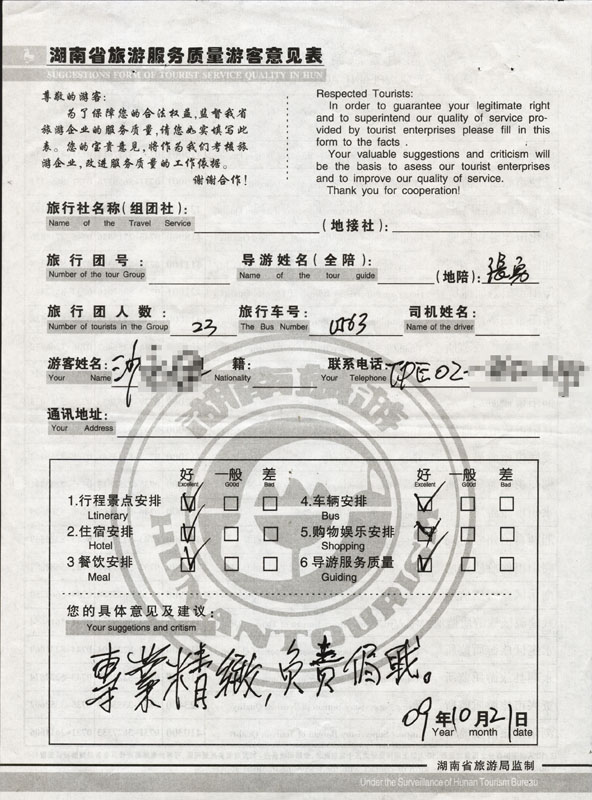 2009年10月18日沙先生一行23人接待質(zhì)量反饋單: