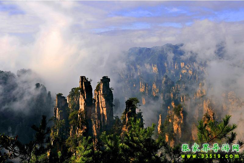 天子山因明初土家族領(lǐng)袖農(nóng)民起義領(lǐng)袖向大坤自號(hào)“向王天子”而得名。天子山東臨索溪峪,南接張家界,北依桑植縣,是武陵源區(qū)四大風(fēng)景之一。它位于“金三角”的最高處,海拔最高1262.5米(昆侖峰),最低534米(獅蘭峪)。景區(qū)總面積67平方公里,環(huán)山游覽線有45公里。